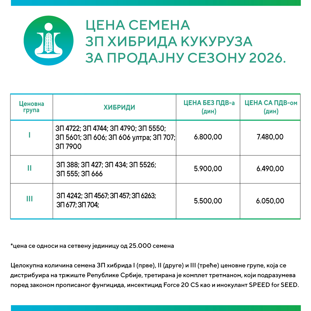 Овде можете пронаћи детаљан ценовник наших хибрида кукуруза. Наш тим стручњака стоји вам на располагању за сваку врсту помоћи и савета, како бисмо заједно допринели унапређењу ваше пољопривредне производње.