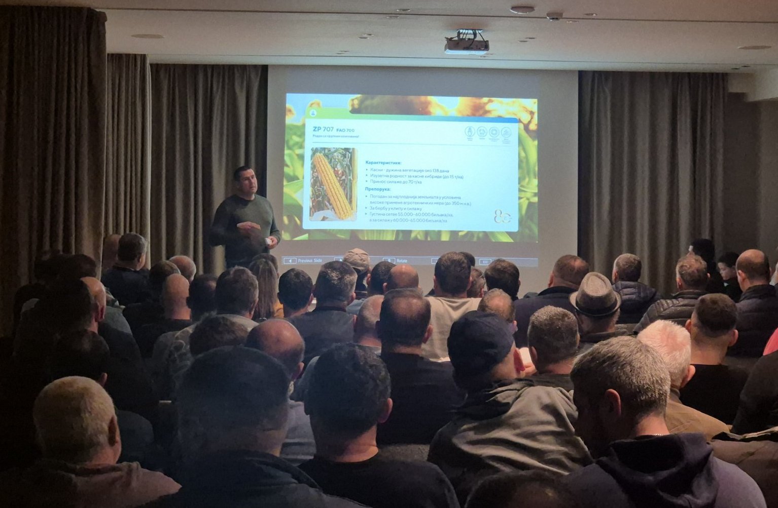 Prisutnim proizvođačima se obratio stručni saradnik Instituta Marko Tadić koji je proizvođačima istakao najvažnije karakteristike novih hibrida za gajenje u ovim agroekološkim uslovima i to ZP 4242, ZP 4744, ZP 4722, ZP 5550, ZP 5601, ZP 6263.